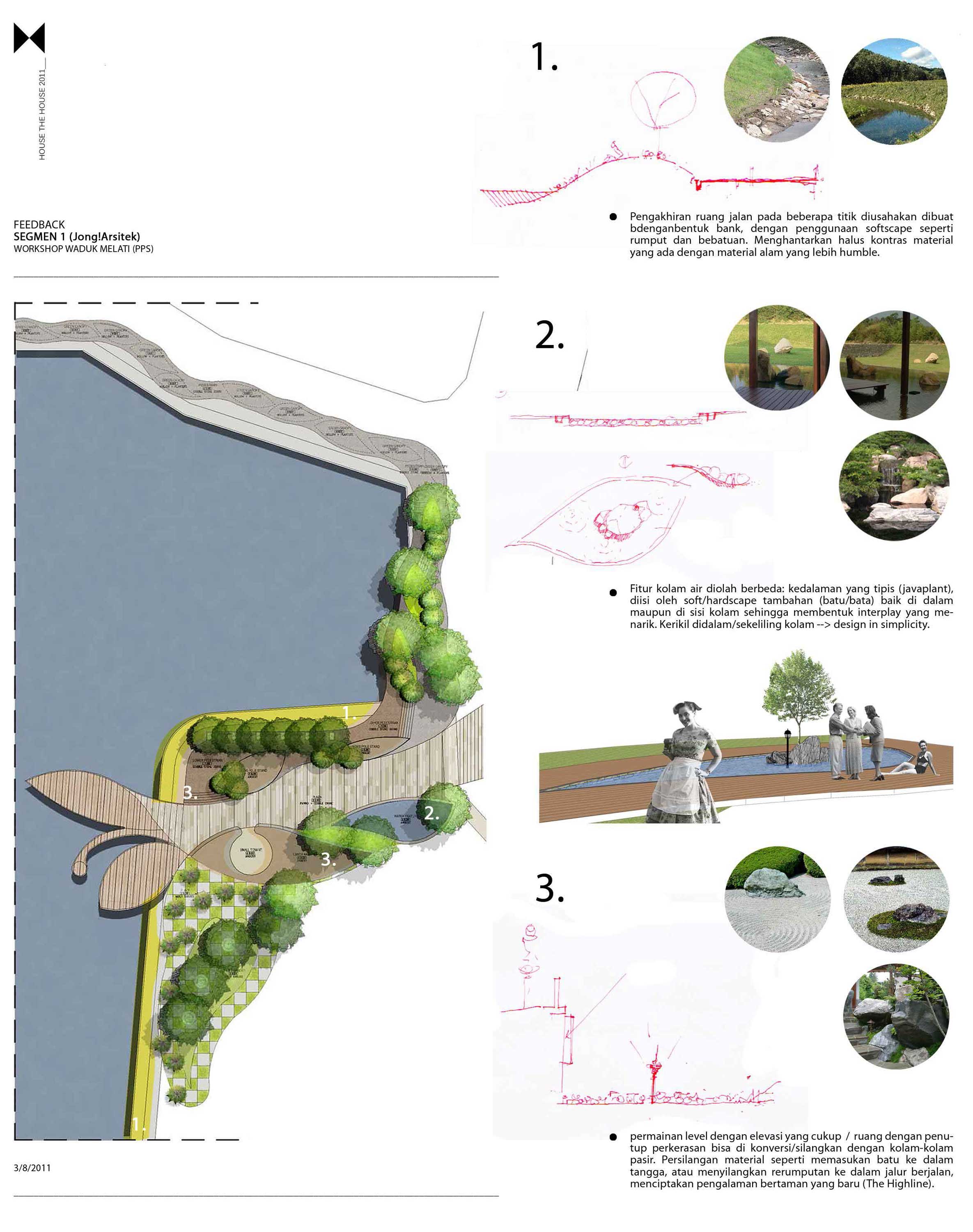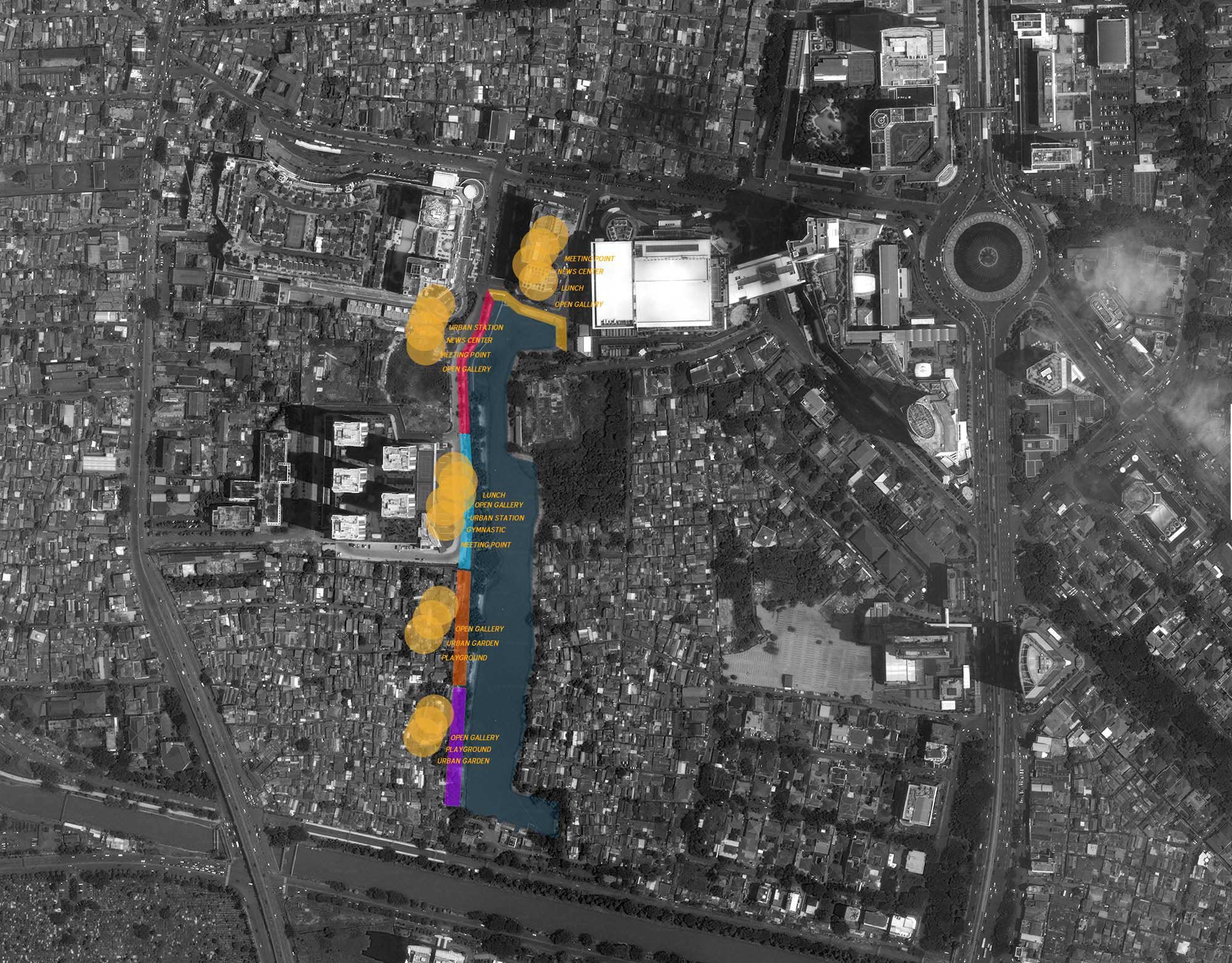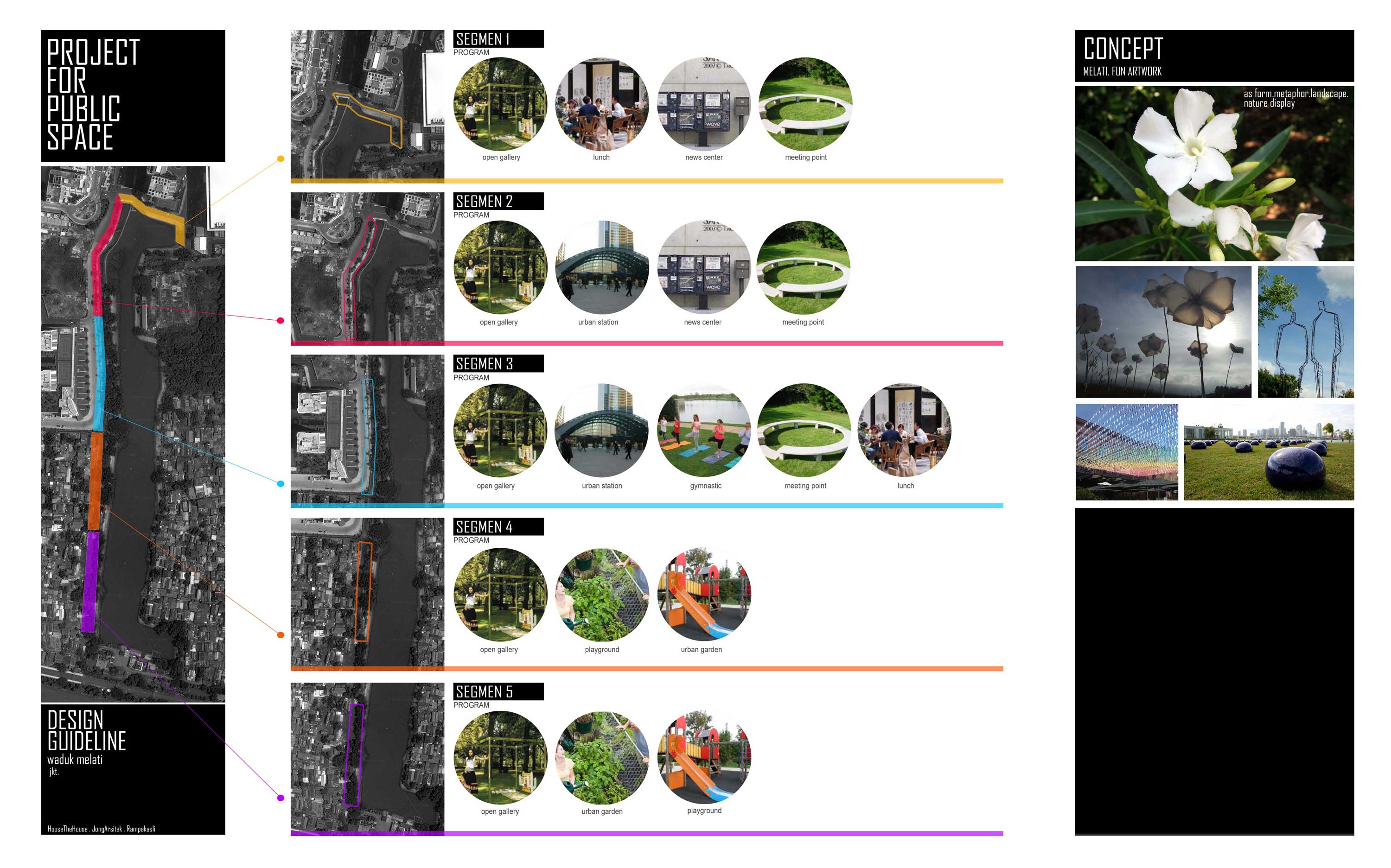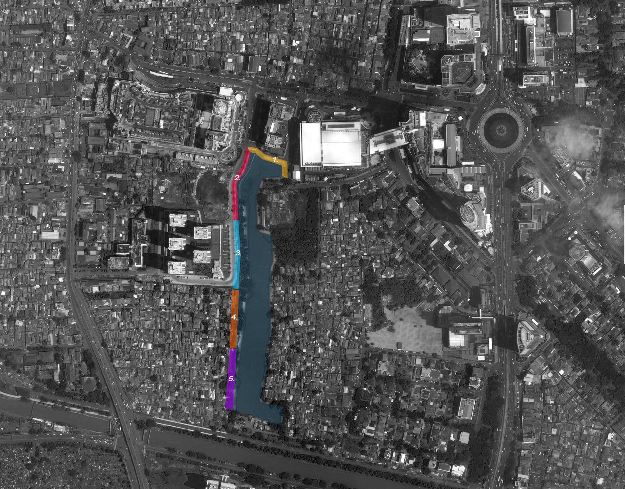 Gagasan kami adalah memberikan ruang publik dengan membagi menjadi 5 tema sesuai dengan karakter, kondisi dan kebutuhan ruang di sekitarnya. Dapat di lihat di Peta, Bagian 1 adalah ruang publik sebagai tempat transit bagi apartemen dan mall Grand Indonesia. Bagian 2 adalah ruang peningkatan kualitas pedestrian yang sudah sempit di samping Jalan Teluk Betung 1 samping Apartemen Ascot menuju Thamrind City. Bagian 3 adalah optimasi taman dan pulau kecil yang ada di depan Thamrind Residence. Sedangkan Bagian 3 dan 4 adalah pembuatan taman sepanjang pinggir danau untuk permukiman Dukuh Pinggir.