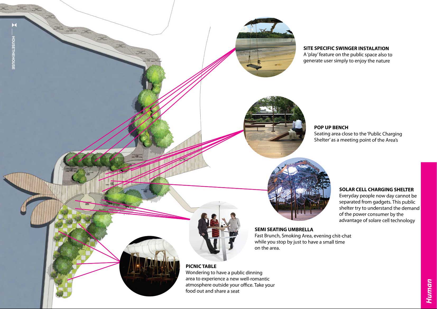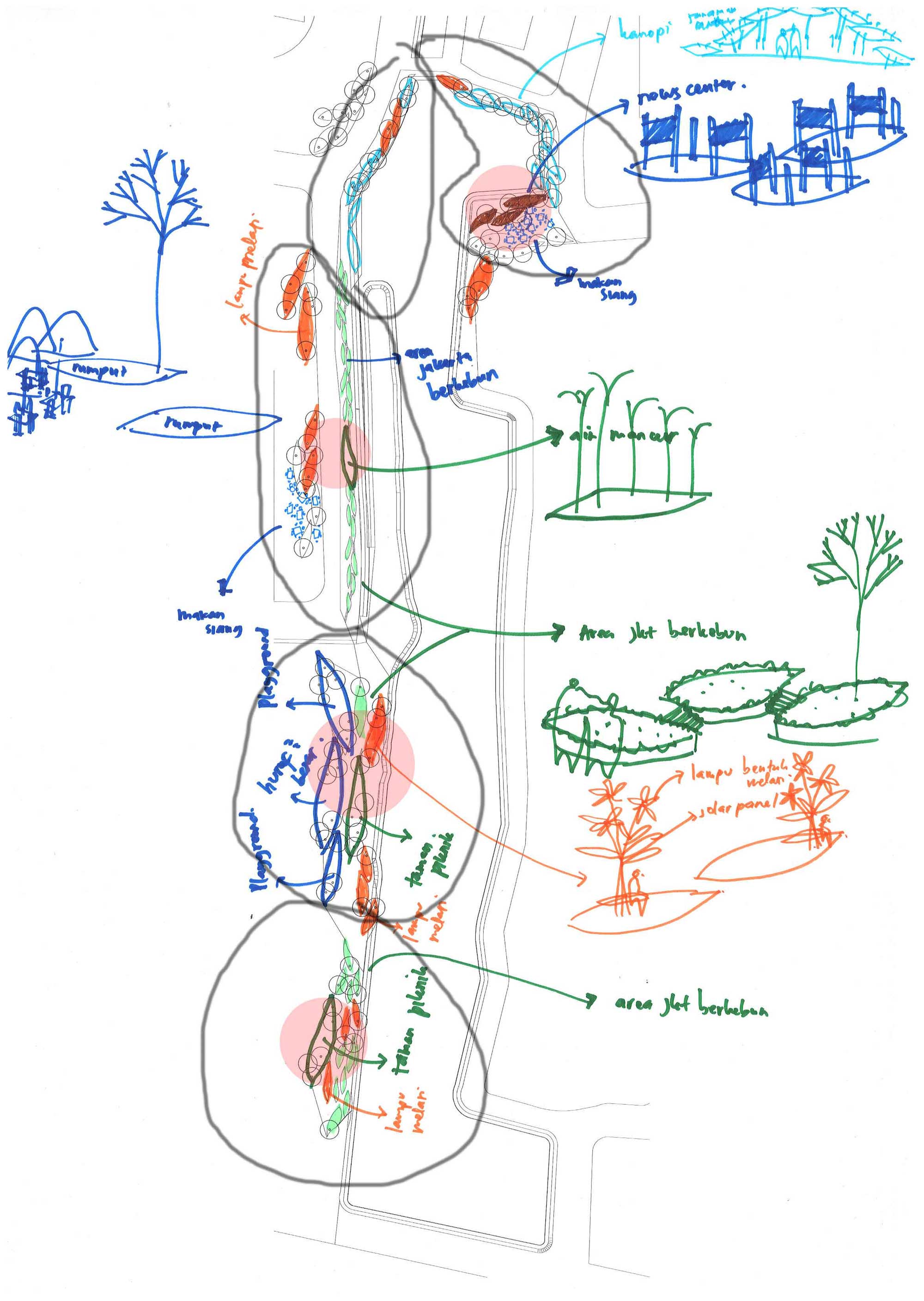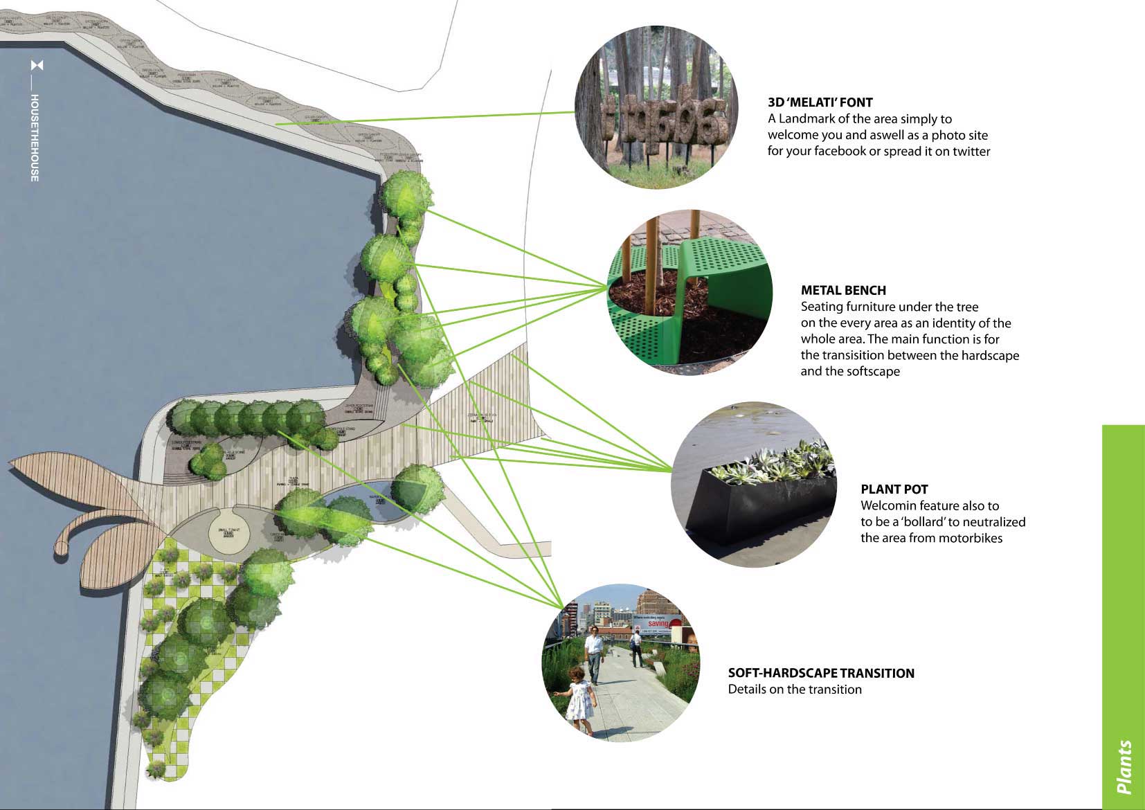 Gagasan kami adalah memberikan ruang publik dengan membagi menjadi 5 tema sesuai dengan karakter, kondisi dan kebutuhan ruang di sekitarnya. Dapat di lihat di Peta, Bagian 1 adalah ruang publik sebagai tempat transit bagi apartemen dan mall Grand Indonesia. Bagian 2 adalah ruang peningkatan kualitas pedestrian yang sudah sempit di samping Jalan Teluk Betung 1 samping Apartemen Ascot menuju Thamrind City. Bagian 3 adalah optimasi taman dan pulau kecil yang ada di depan Thamrind Residence. Sedangkan Bagian 3 dan 4 adalah pembuatan taman sepanjang pinggir danau untuk permukiman Dukuh Pinggir.