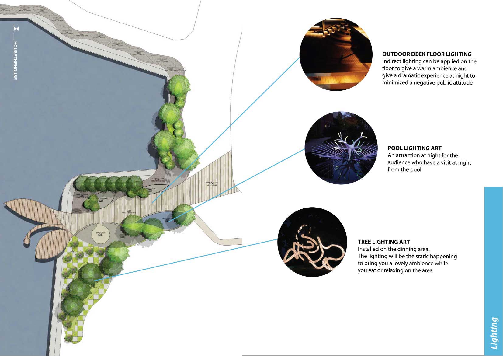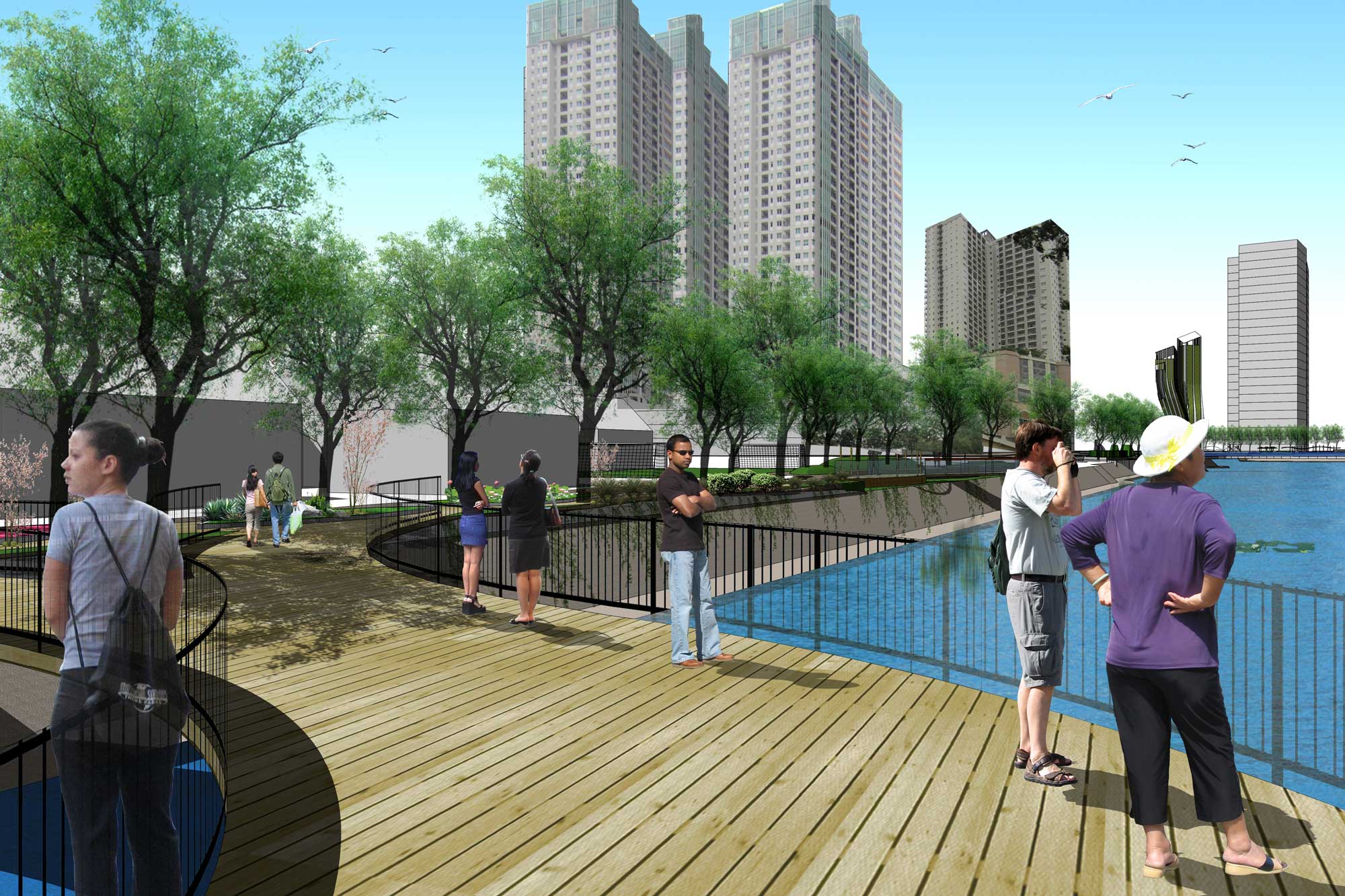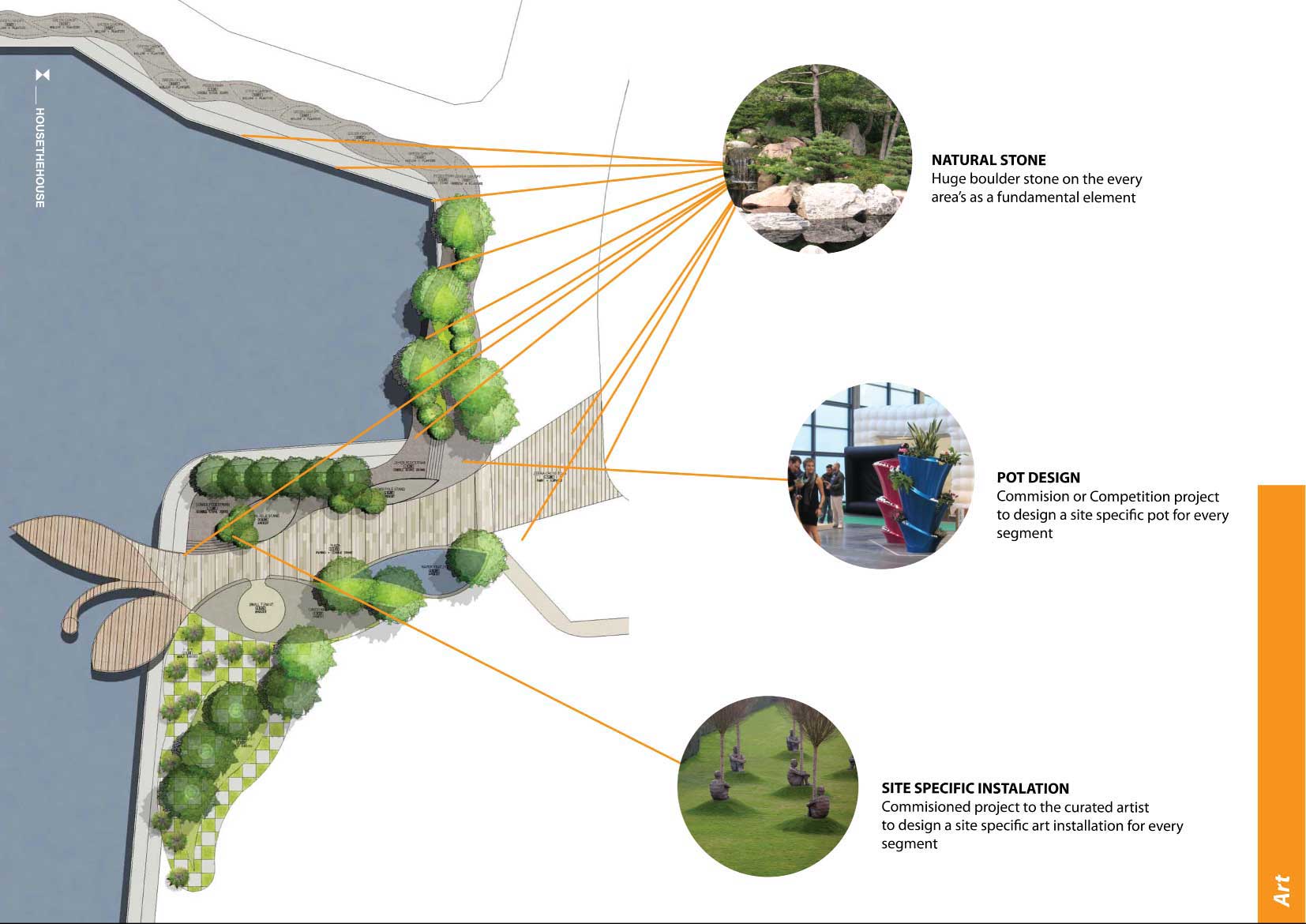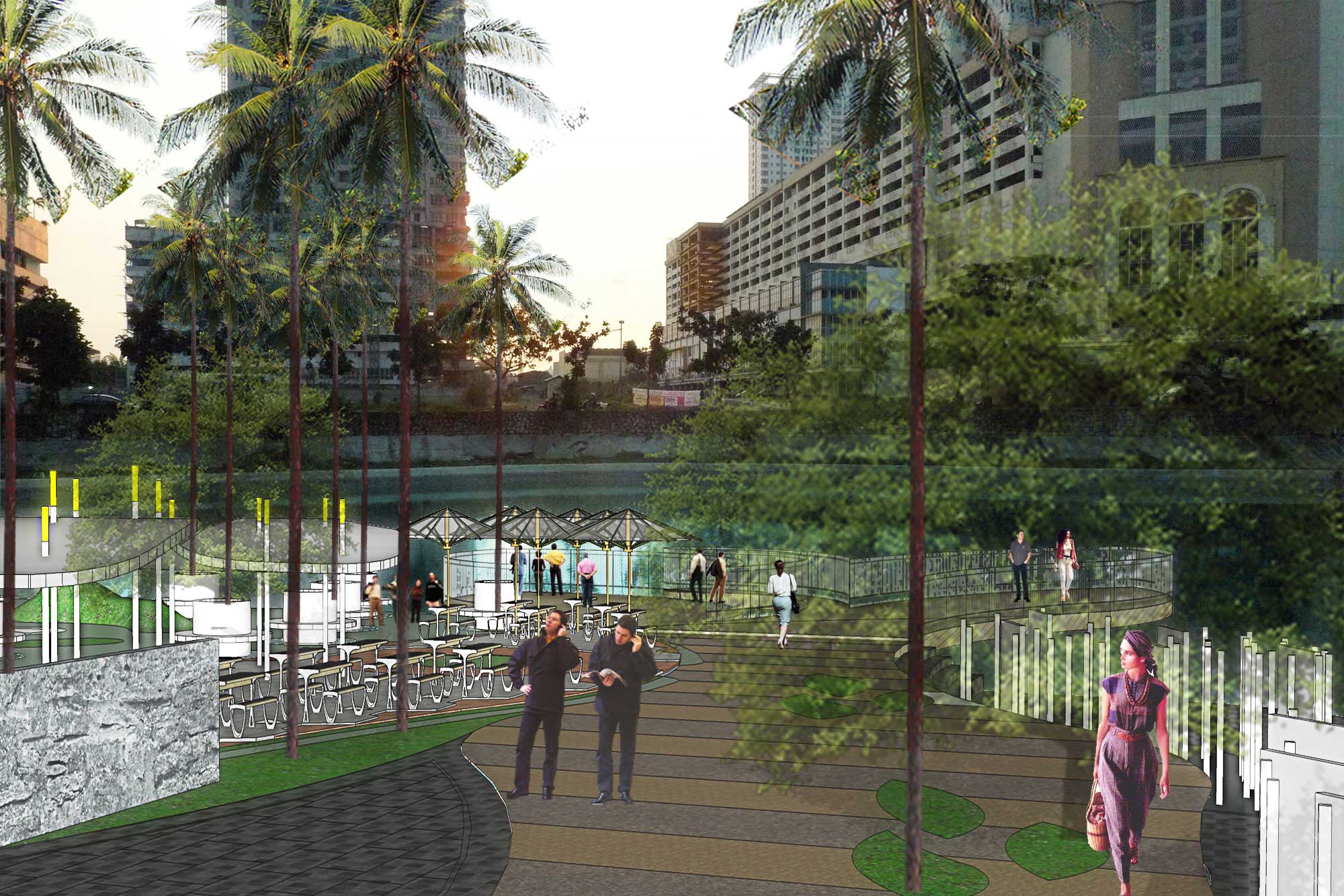 Gagasan kami adalah memberikan ruang publik dengan membagi menjadi 5 tema sesuai dengan karakter, kondisi dan kebutuhan ruang di sekitarnya. Dapat di lihat di Peta, Bagian 1 adalah ruang publik sebagai tempat transit bagi apartemen dan mall Grand Indonesia. Bagian 2 adalah ruang peningkatan kualitas pedestrian yang sudah sempit di samping Jalan Teluk Betung 1 samping Apartemen Ascot menuju Thamrind City. Bagian 3 adalah optimasi taman dan pulau kecil yang ada di depan Thamrind Residence. Sedangkan Bagian 3 dan 4 adalah pembuatan taman sepanjang pinggir danau untuk permukiman Dukuh Pinggir.