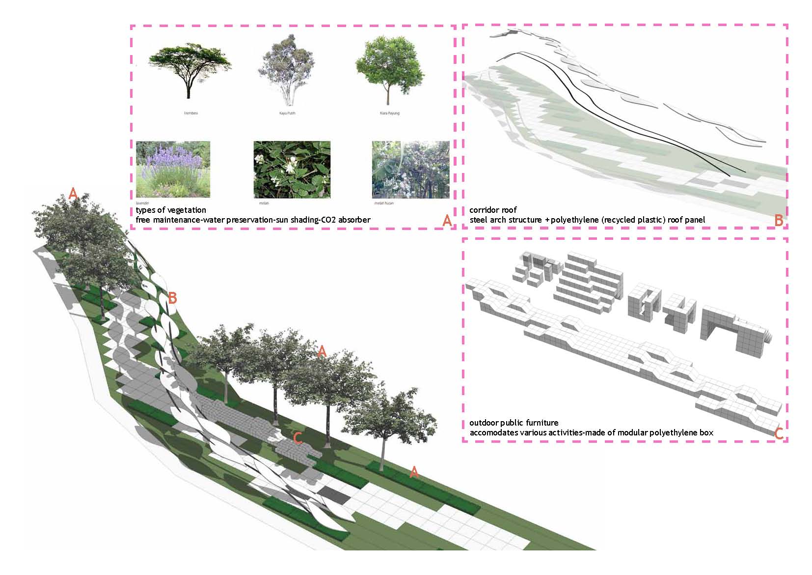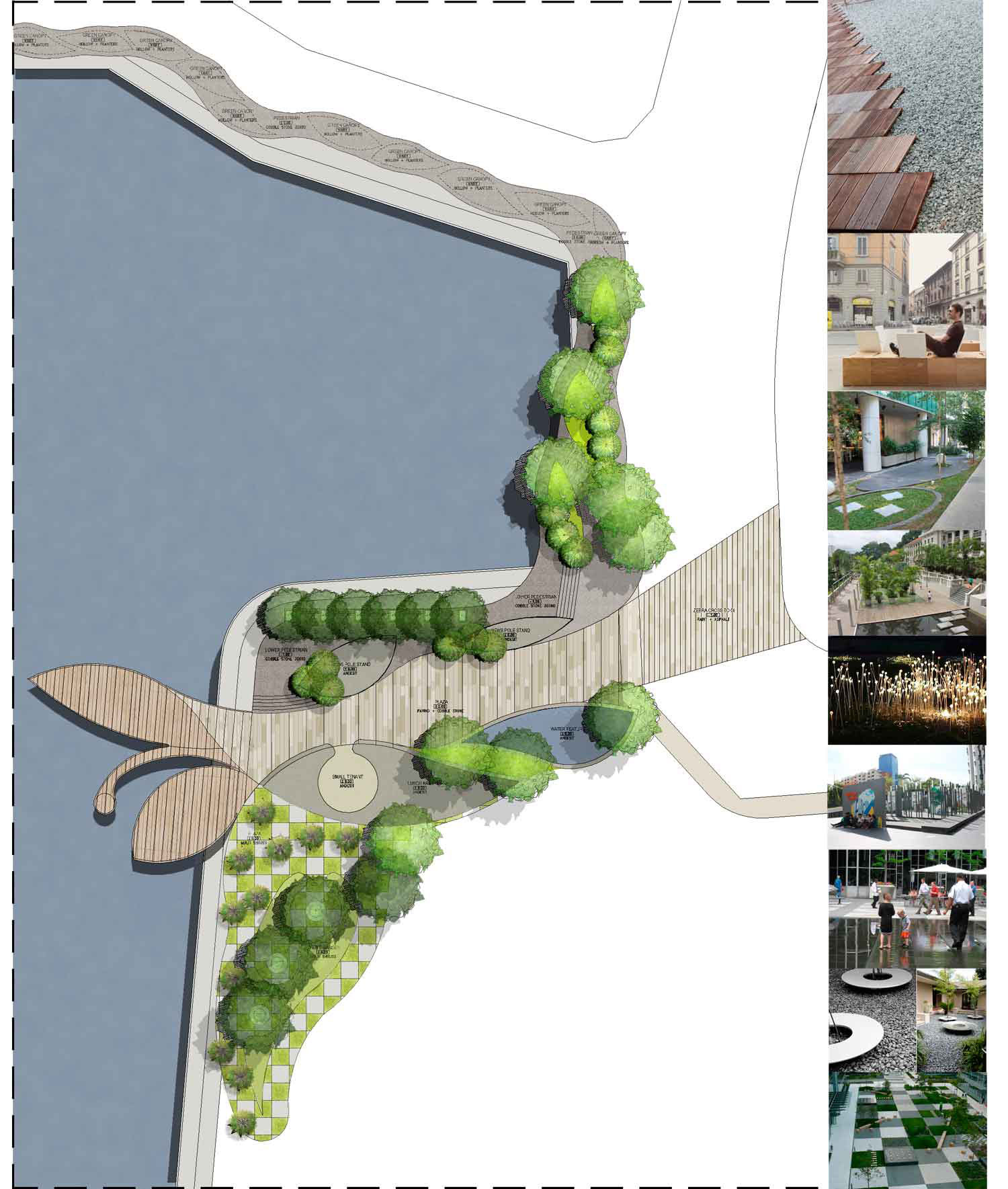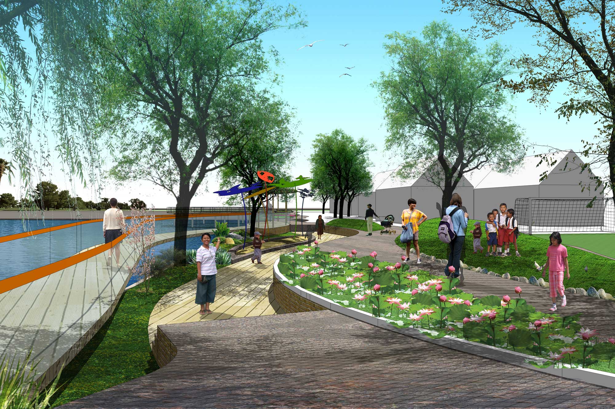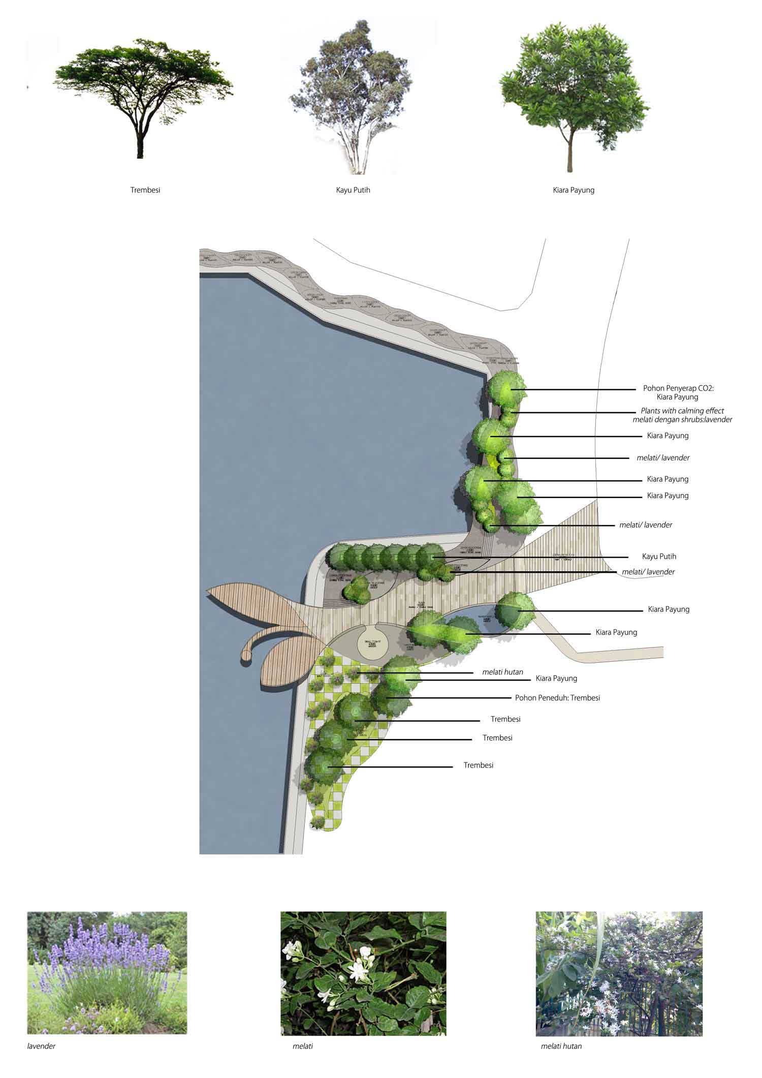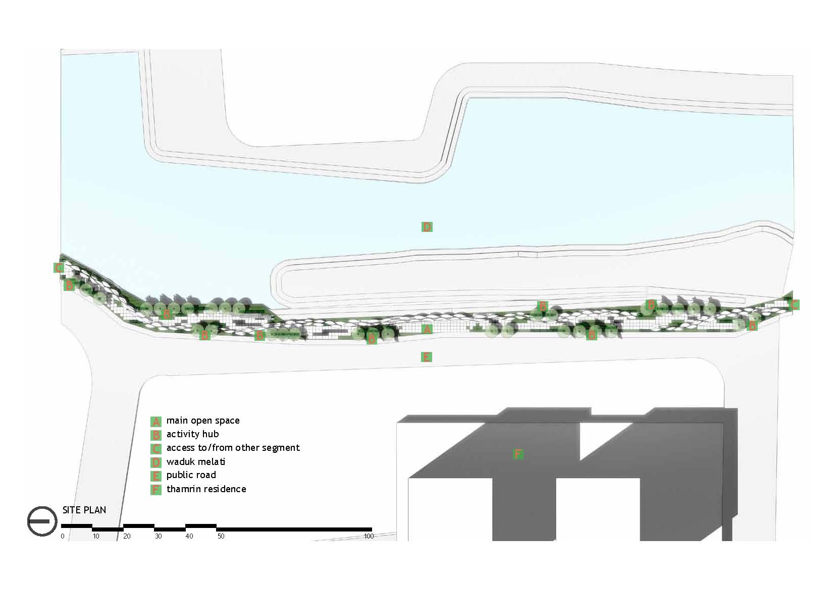 Gagasan Placemaking yang di adaptasi dari PPS ini kemudian mencoba memberikan program ruang yang sesuai dengan karakter permasing-masing bagian. Dari Galeri, ruang baca, ruang bermain anak, atau urban furniture agar masyarakat bisa menikmati taman di pinggir danau ini dengan maksimal.