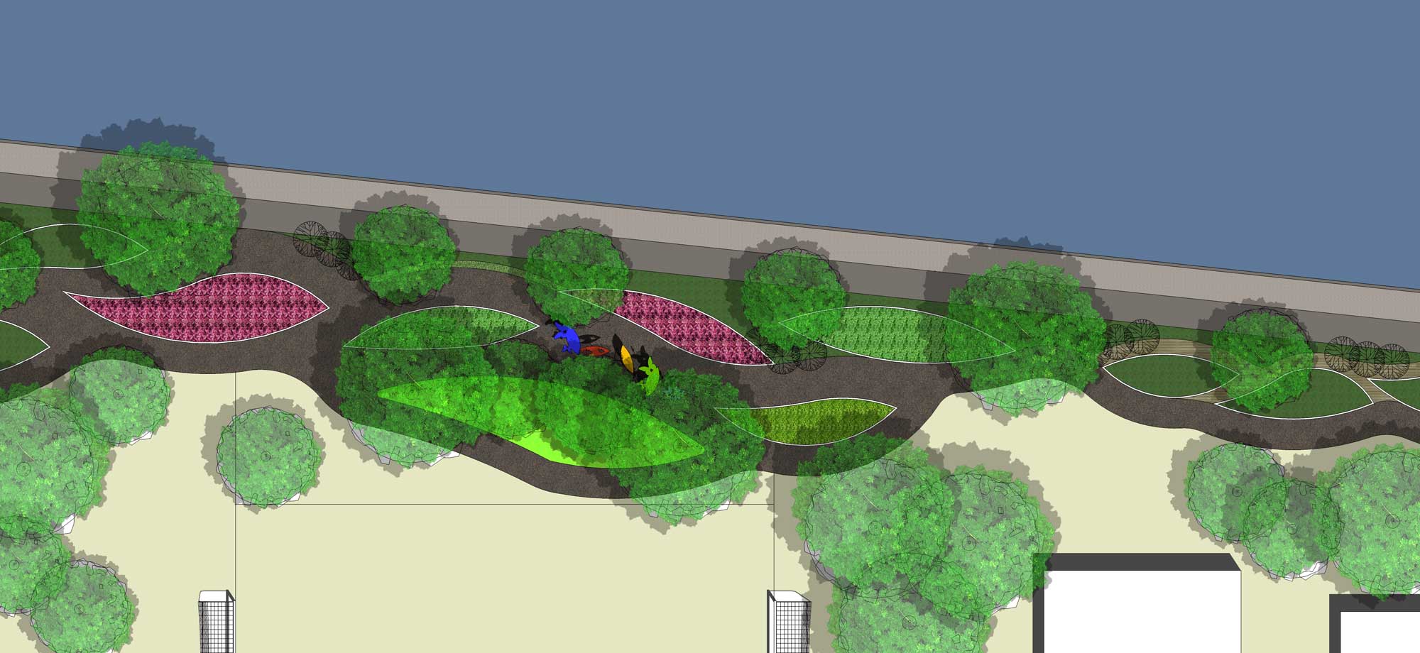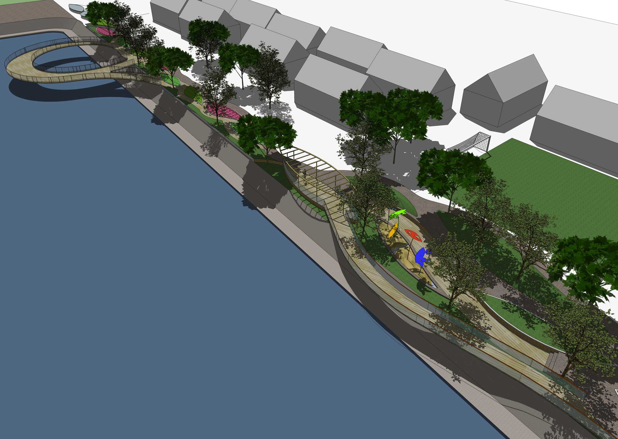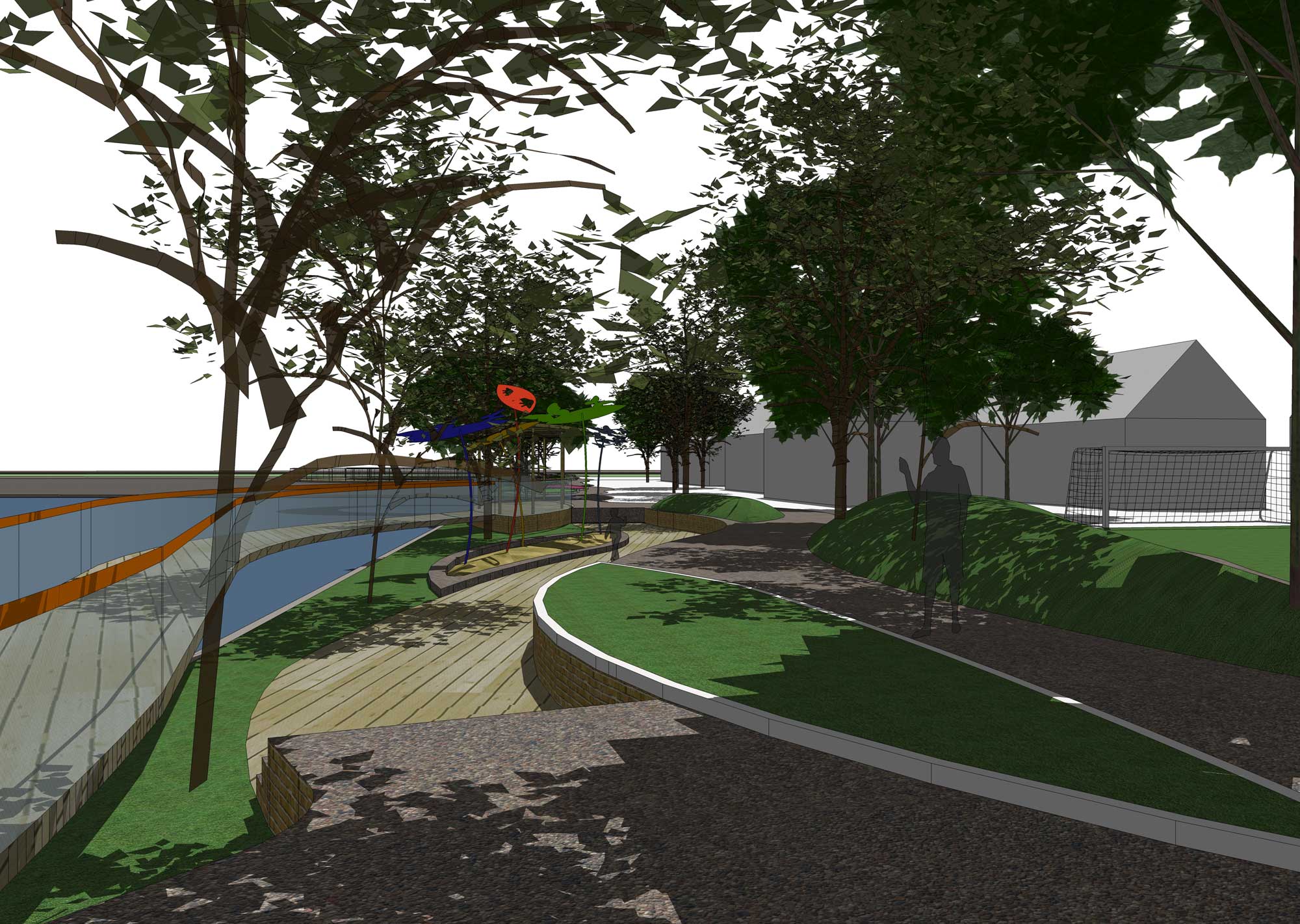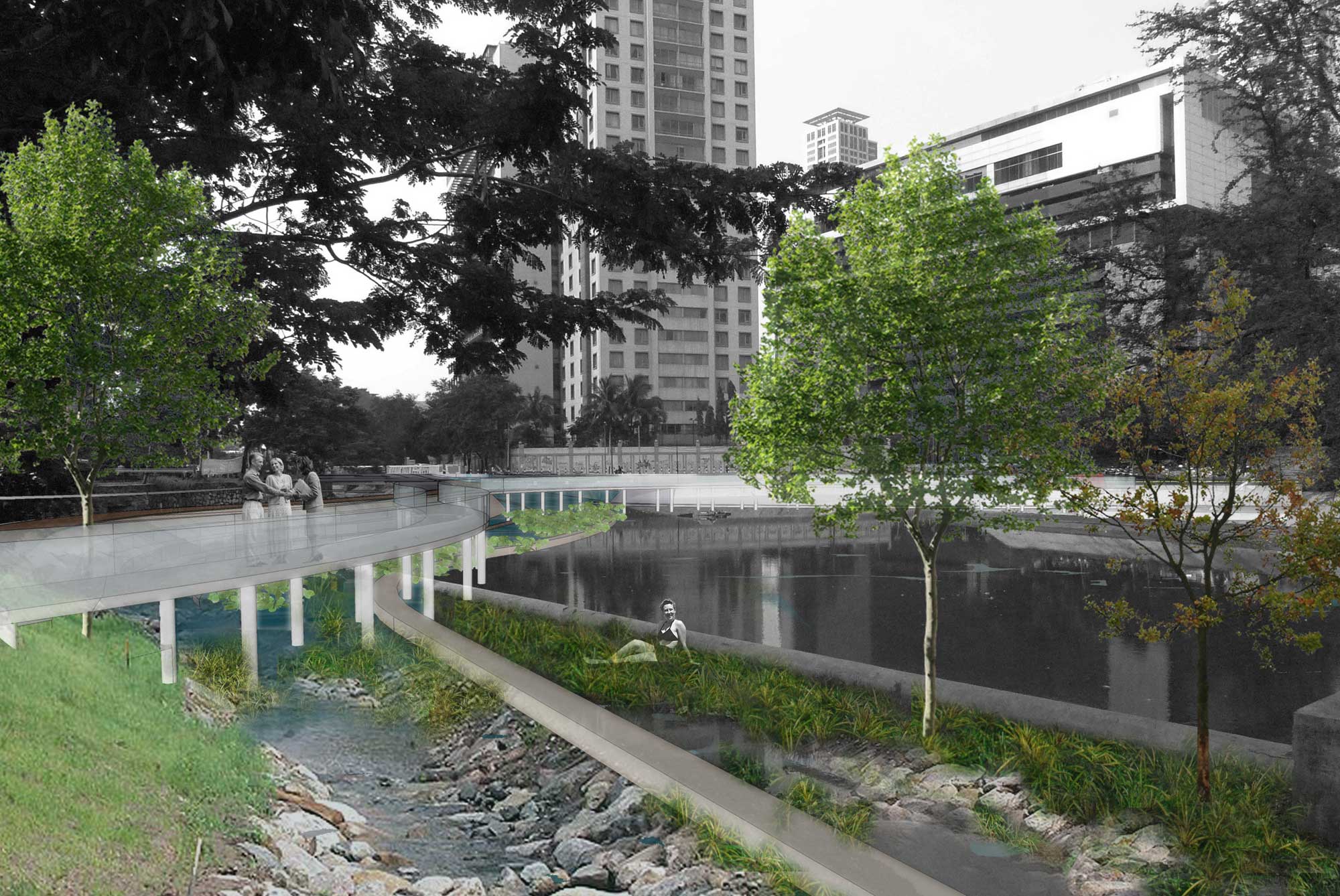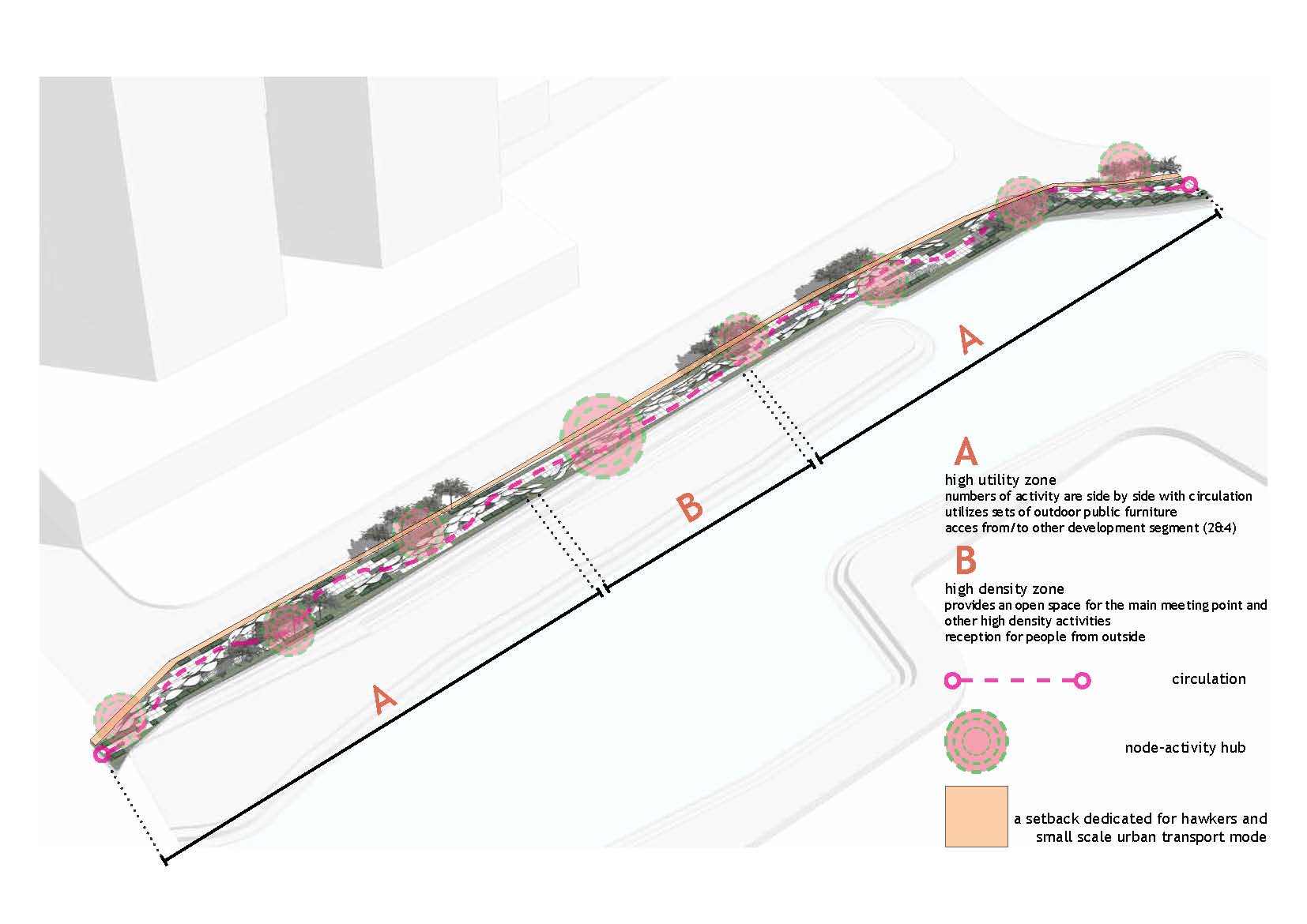 Gagasan Placemaking yang di adaptasi dari PPS ini kemudian mencoba memberikan program ruang yang sesuai dengan karakter permasing-masing bagian. Dari Galeri, ruang baca, ruang bermain anak, atau urban furniture agar masyarakat bisa menikmati taman di pinggir danau ini dengan maksimal.