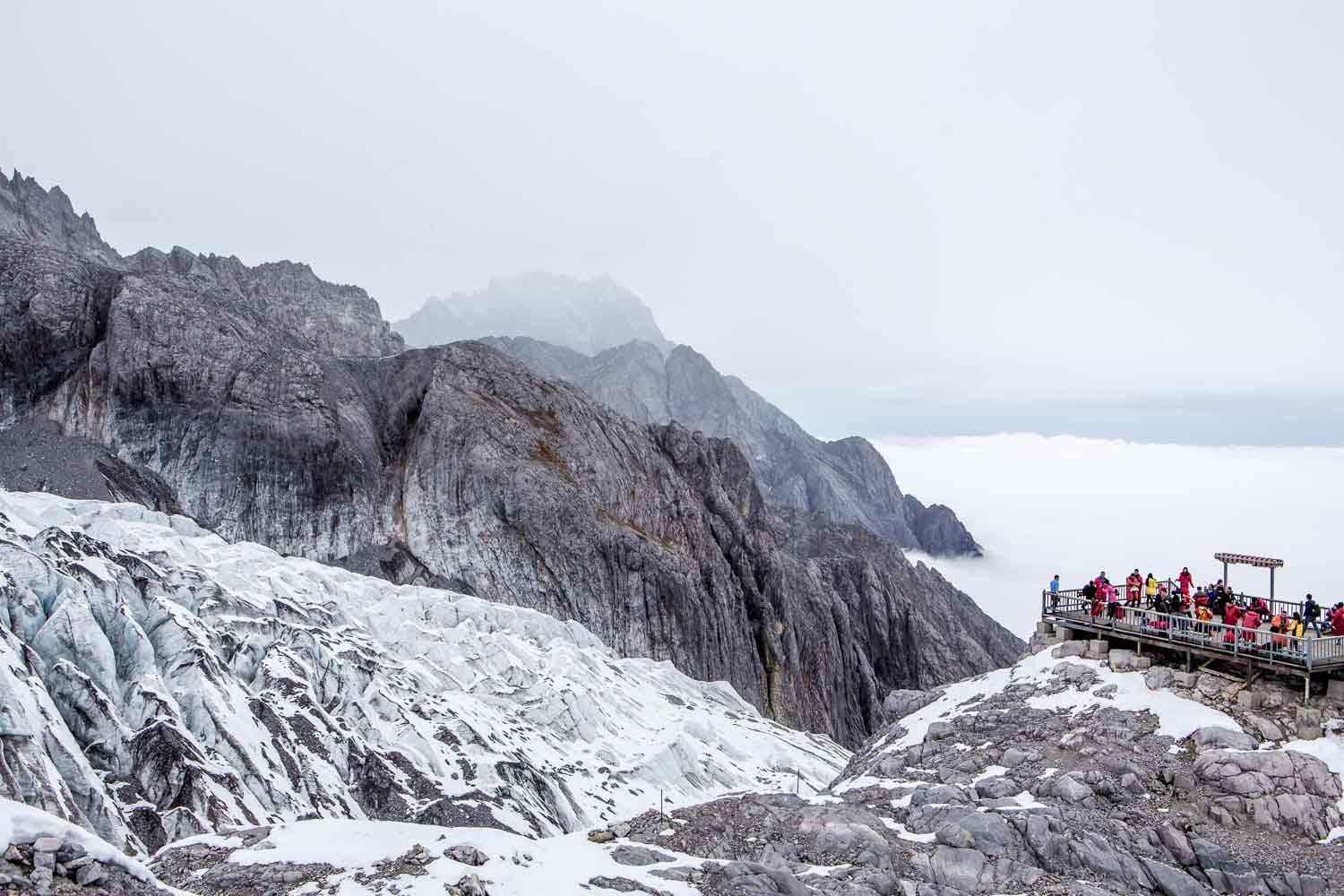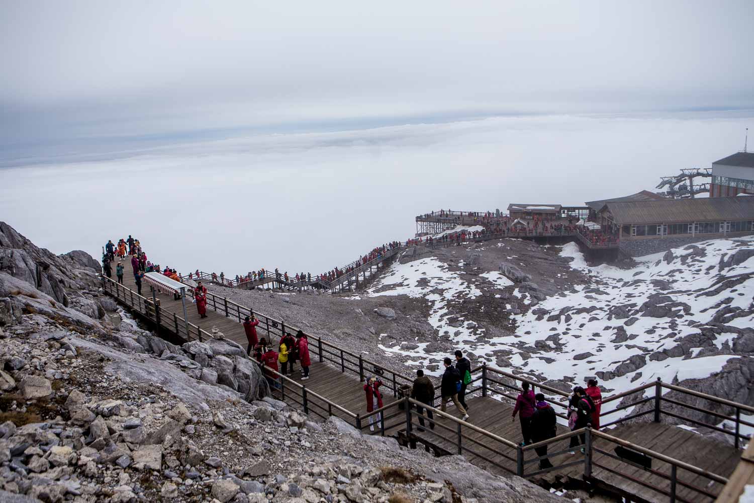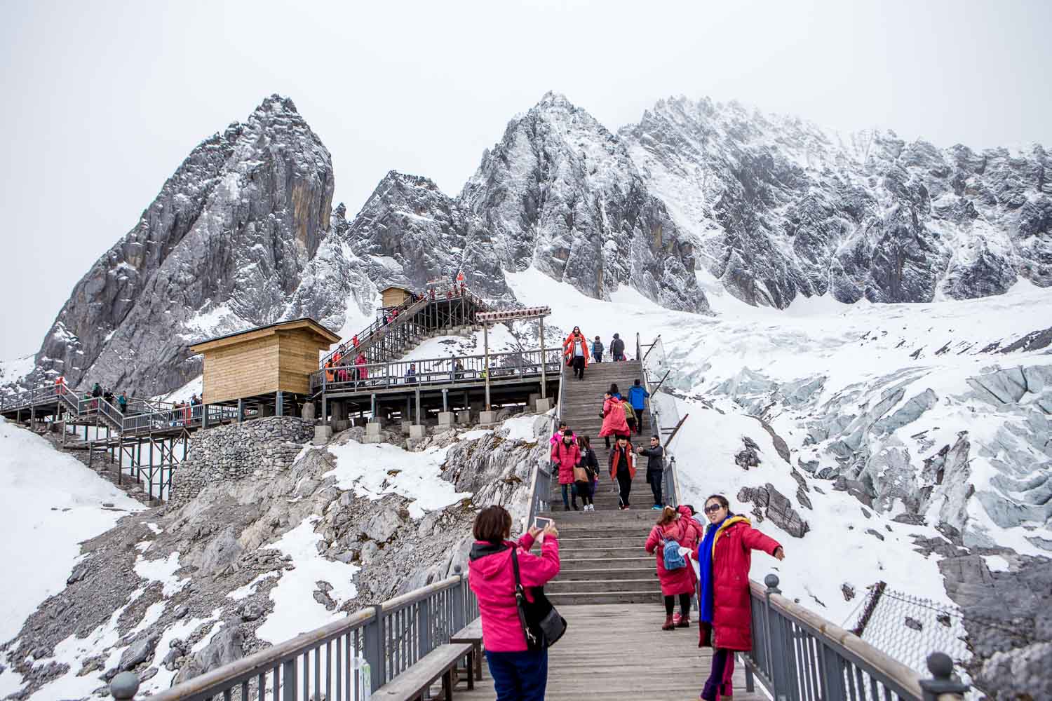 Sekarang, saya sedang beranjak turun. Saya menyusuri dek kayu selebar 3 meter yang telah di buat oleh Pemerintah China untuk menuju lembah Glasier gunung Yulong yang puncaknya mencapai 5596 m di atas permukaan air laut. Hanya 3 dari 20 rombongan kami yang bisa mencapai puncak jalur pendakian yang berada di 4680 m diatas permukaan air laut karena oksigen yang tipis. Gunung Yulong memiliki permukaan es abadi diatas ketinggian 4500m sehingga menjadi daya tarik bagi pengunjungnya. Untuk mencapai puncaknya, Pemerintah China memfasilitasi dengan kereta gantung dari bangunan penerima dari ketinggian 3000 m ke 4500 m. Setelah itu, pengunjung bisa menikmati glasier dengan pemandangan kota Lijiang di bawahnya yang sering kali tertutup awan.